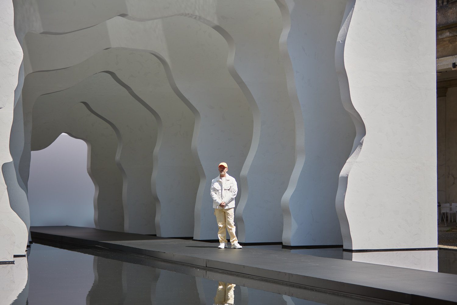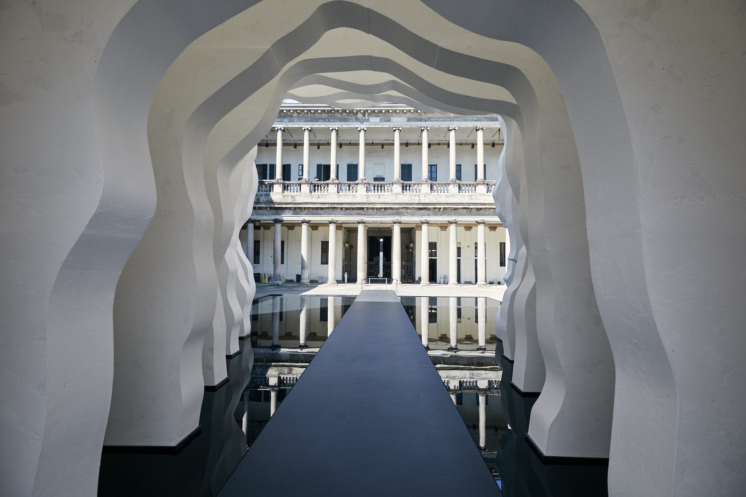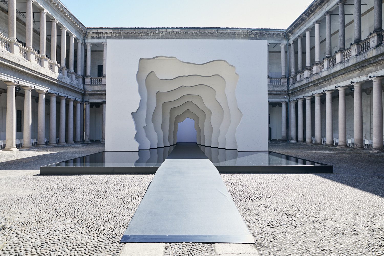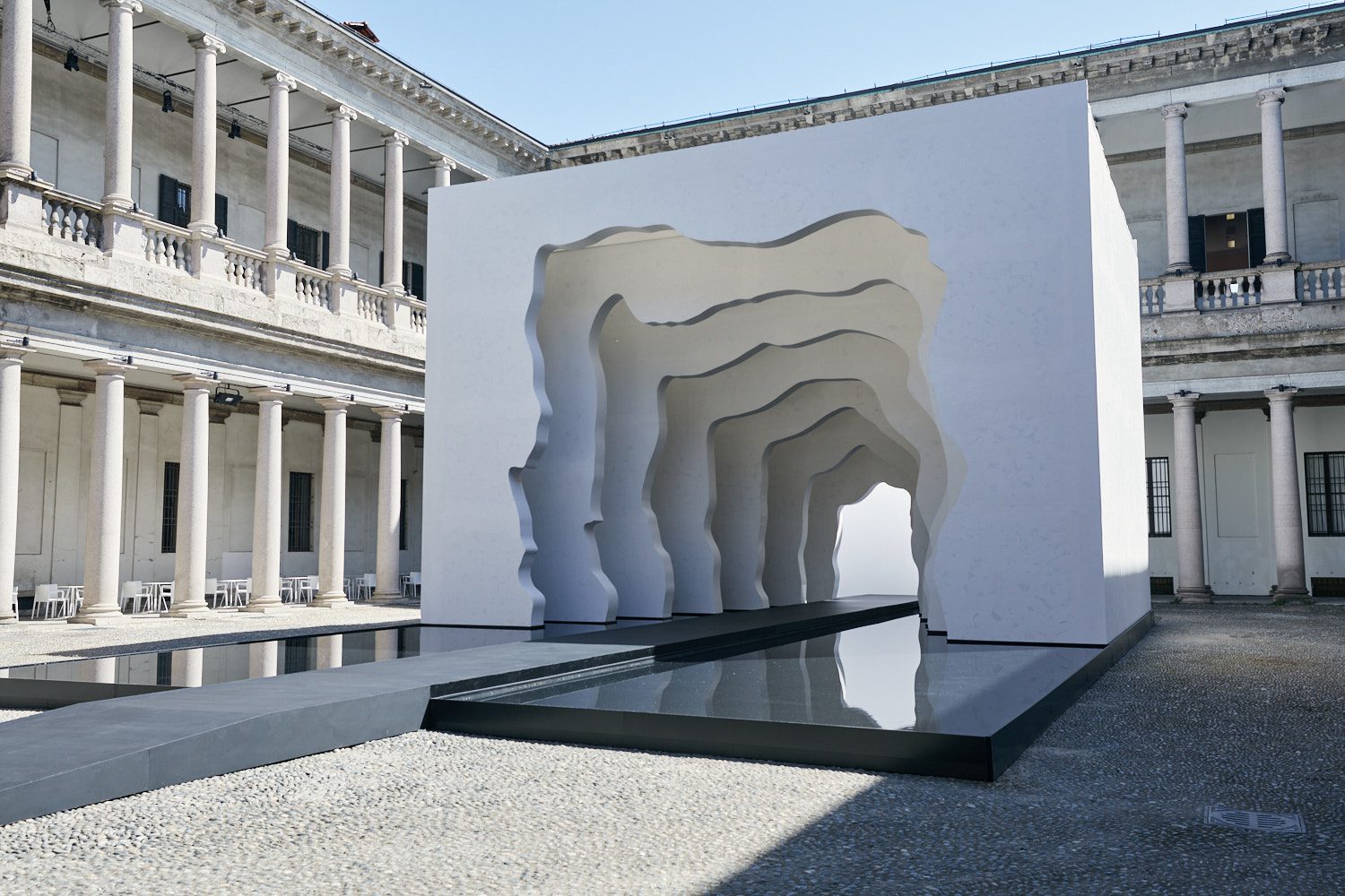 Dentro da instalação, um lago atua como uma superfície espelhada para duplicar e refletir a abertura do volume cavernoso. A intenção de Arsham é que os visitantes contemplem a aceitação do espaço e sua maleabilidade, entendendo a relação entre os volumes. A cadência das paredes imita o ritmo das colunas dentro do Palazzo, contribuindo para toda uma atmosfera que representa movimento ou fluxo. “O fluxo de água é vivenciado tanto no espaço negativo quanto no positivo, independentemente da ‘função’ de uma forma”, diz Daniel Arsham. “Em Divided Layers, os visitantes vivenciam estar dentro da cuba, em vez de serem usuários de uma peça funcional.”