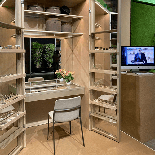 Em seu espaço de 2,5 m² a Ornare apresenta a versão Beauty, focado em penteadeiras. A linha, bastante versátil, é inspirada no sistema de armários Ikigai criado pela marca, mas com um olhar para os armários pequenos.