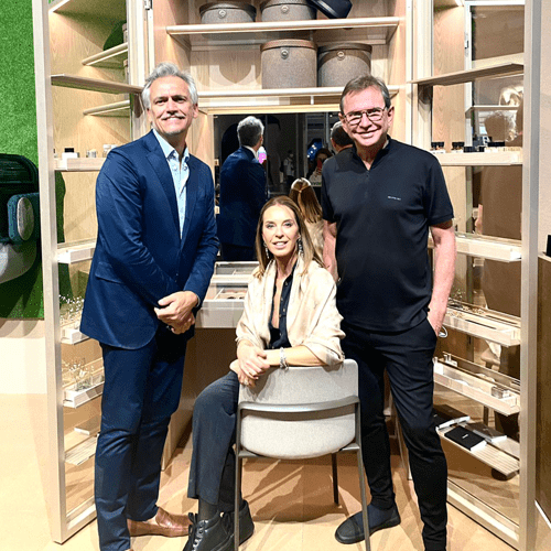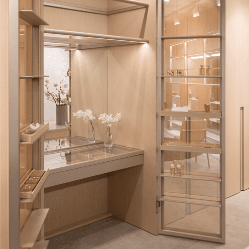 Desenvolvida pelo designer Ricardo Bello Dias, a linha tem uma independência e versatilidade, podendo ser usada para compor o closet ou ser montada de forma individual, totalmente personalizada. Além disso, os móveis possuem luz integrada nas prateleiras e portas equipadas para exibir com destaque os objetos mais preciosos.