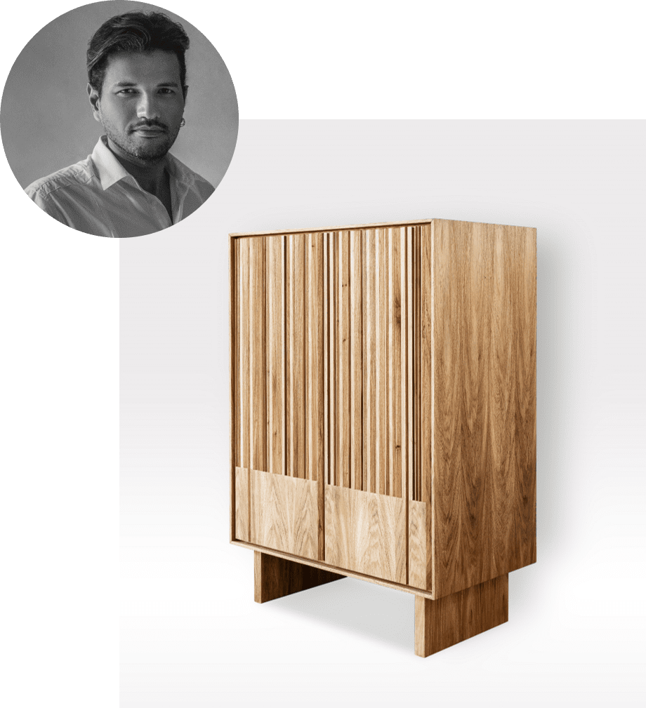 Juno é um móvel robusto feito de madeira e, à primeira vista, parece um armário simples. Mas são os detalhes que criam o interesse e a singularidade de cada peça fabricada. A parte com vazados tem as ripas chanfradas a 45o em diferentes sentidos, a fim de criar movimento pela incidência de luz.