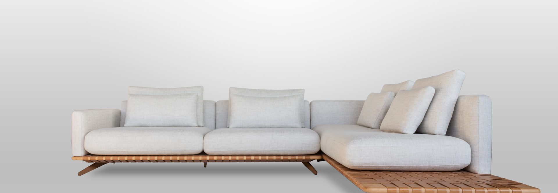 O sofá é uma grande plataforma estruturada em alumínio e madeira com detalhes em couro. Almofadões em módulos que têm lavagem e troca fácil convidam quem usa a deitar e ser envolvido pela maciez. Apesar de ampla, a peça parece flutuar no ambiente.