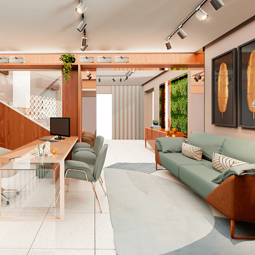 Novos tempos pedem novas soluções, espaços multiuso, agêneros e muita praticidade. Criamos um ambiente autêntico e funcional, para trabalho ou descanso, onde cada detalhe escolhido se mescla perfeitamente entre si. As cores, os materiais e as texturas estão valorizadas e em sintonia. O verde refrescante do painel, a madeira quente do mobiliário, o metal dourado símbolo da riqueza e prosperidade e o vidro bronze espelhado símbolo do luxo e da sorte. Já as formas do sofá, poltronas e cadeira remetem ao conforto, ao acolhimento, dão suporte e apoio corretos para o corpo. Mesas, buffet e estantes cumprem o papel de deixar tudo a mão e organizado. Tudo pensado para criar a atmosfera que um ateliê de Design pede pois a elegância é a única beleza que Veja todo ambiente em INFO E INSCRIÇÕES.