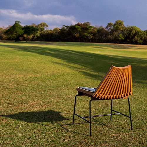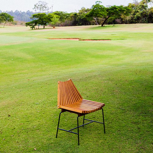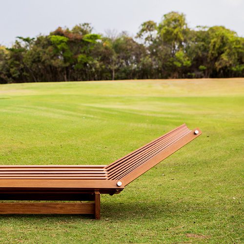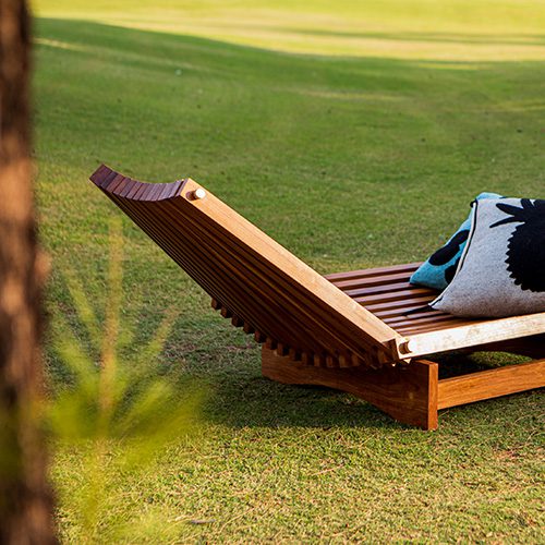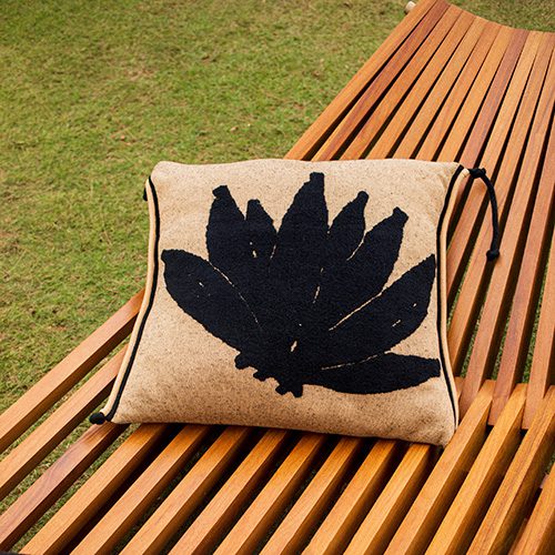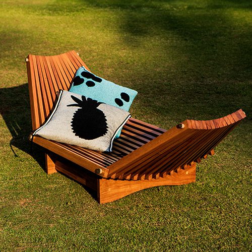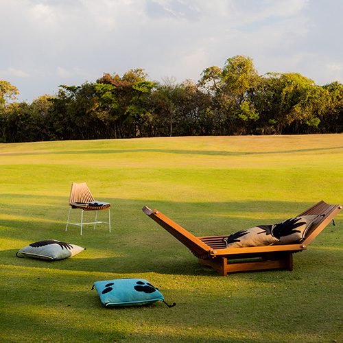 Os móveis, idealizados pela Alva, recebem almofadas criadas pela Coven. A linha parte de um princípio tradicional de ripas de madeira que se cruzam e se movimentam, o que permite ajustar os encostos em posições diversas. A espreguiçadeira acomoda até 2 pessoas e convida ao ócio e à contemplação. A cadeira tem pés metálicos e pode ser usada em áreas internas ou externas. É a primeira cadeira da Alva. Ambas são complementadas pelo primoroso trabalho da Coven. Silhuetas pretas de frutas tropicais, tecidas no autêntico jacquard atoalhado da marca, estampam as almofadas, abordando a ideia de brasilidade de uma forma lúdica e expressiva.