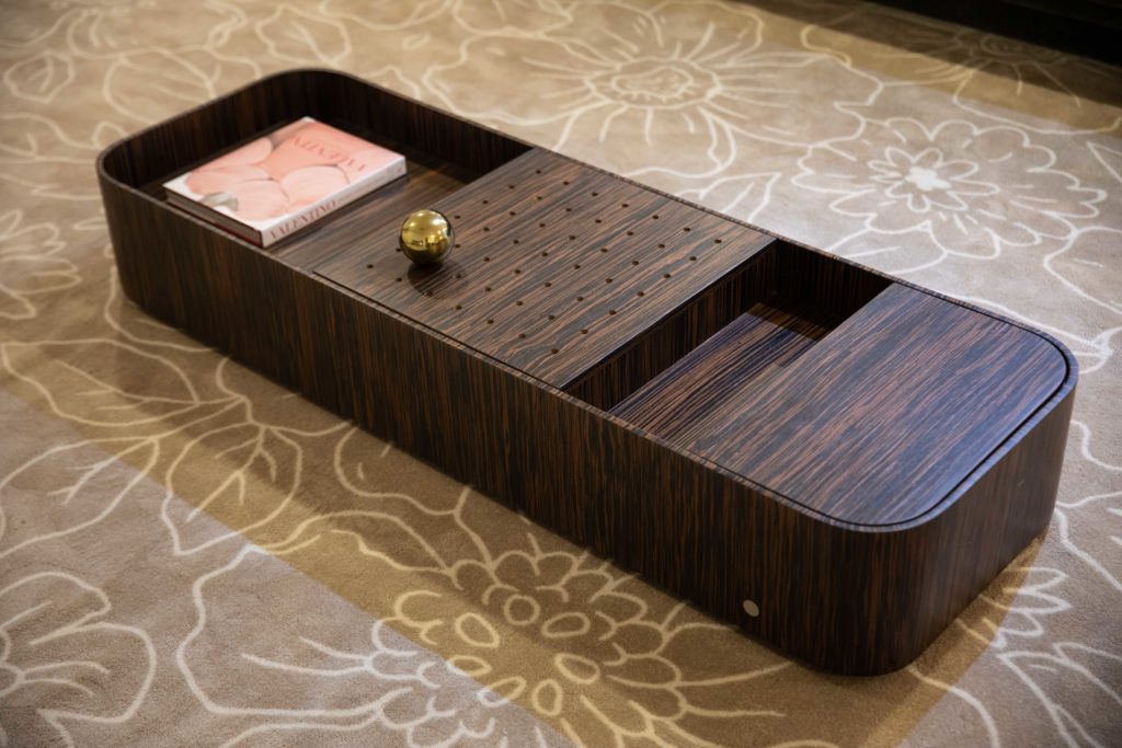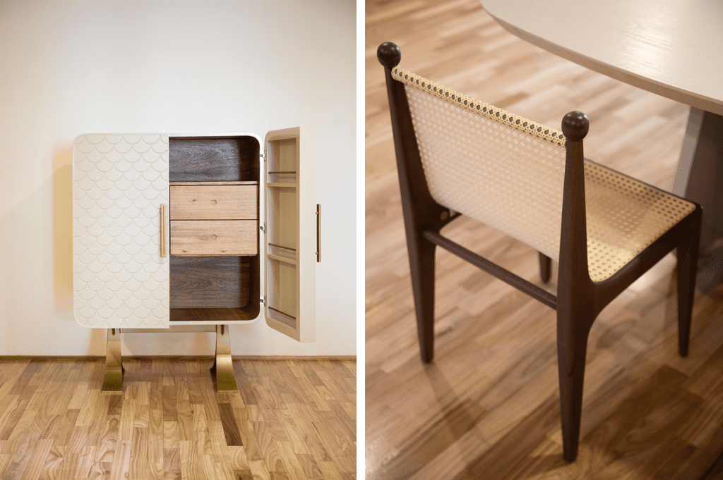 O cruzamento das três vertentes fica evidente em peças como a mesa de centro Whisky, feita de ébano de macassar, que traz o caráter sóbrio da madeira escura, expressa suavidade em seus cantos arredondados e permite a interação com os compartimentos para guardar objetos. Um puxador em formato de bola, encaixado no tampo, arremata o móvel com graça. Ou na cadeira Lolita, que faz a clássica combinação entre madeira e palhinha ganhar delicadeza e uma surpreendente estrutura de metal.